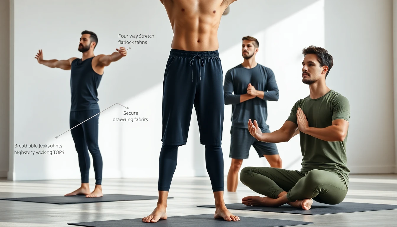 Yoga pants, shorts, fitted tops, and lightweight jackets lead men's purchases. Construction details separate winners from failures. Four-way stretch knit with spandex blends gives full range of motion. Men moving through warrior sequences or low lunges need fabrics that don't restrict.